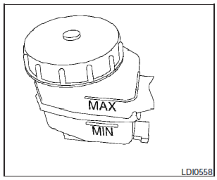 Check the brake fluid level in the reservoir. If the fluid level is below the MIN line or the brake warning light comes on, add Genuine NISSAN Super Heavy Duty Brake Fluid or equivalent DOT 3 fluid up to the MAX line. If fluid must be added frequently, the system should be checked by a NISSAN dealer.